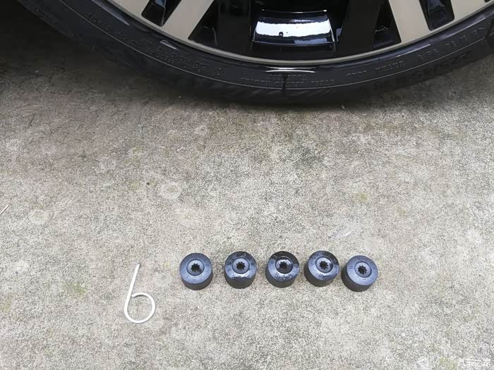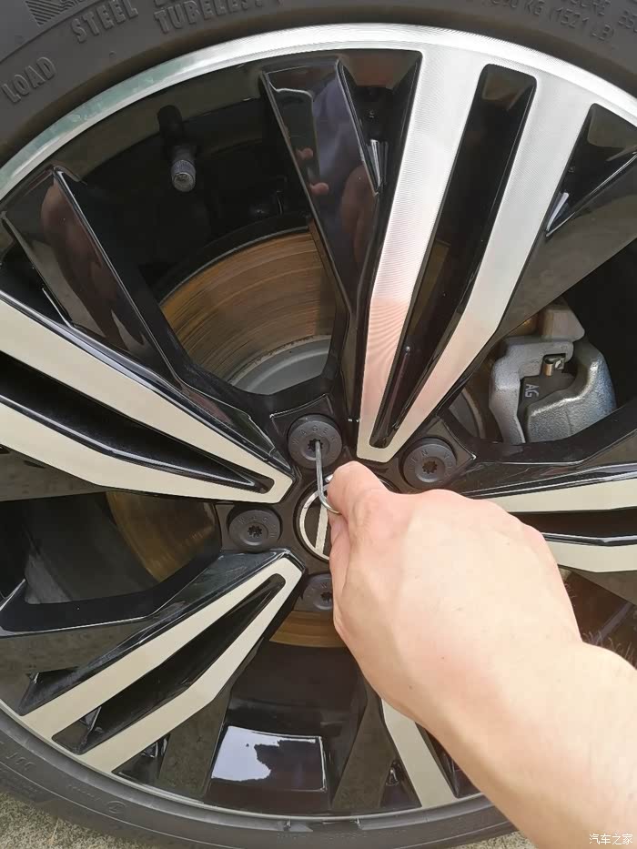 大众的车子基本都配有轮毂螺丝帽,在拆卸轮毂螺丝之前要用小勾子像这样把帽子拔下来~~