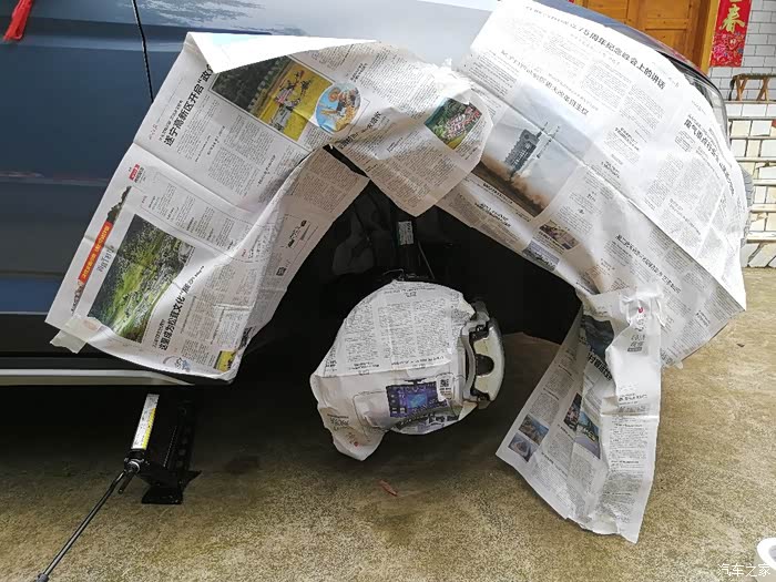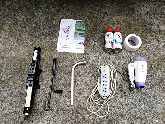 俗话说得好:磨刀不误砍柴工。改的效果怎么样姑且不说,工具还是必须有模有样!工具介绍:千斤顶、摇把、扳手、插线板、电吹风、纸胶带、自喷漆、小勾子、报纸。多说一句:七座拓豪魔力灰本身不带千斤顶和轮胎扳手的,自己在网上买了这些才能开搞!