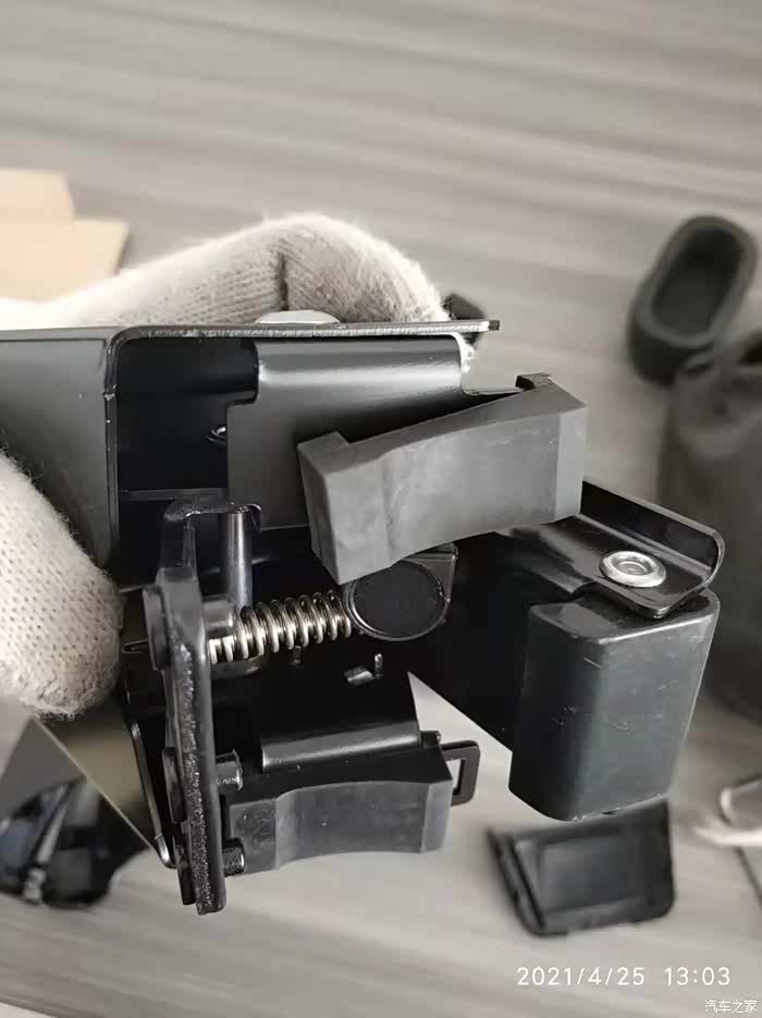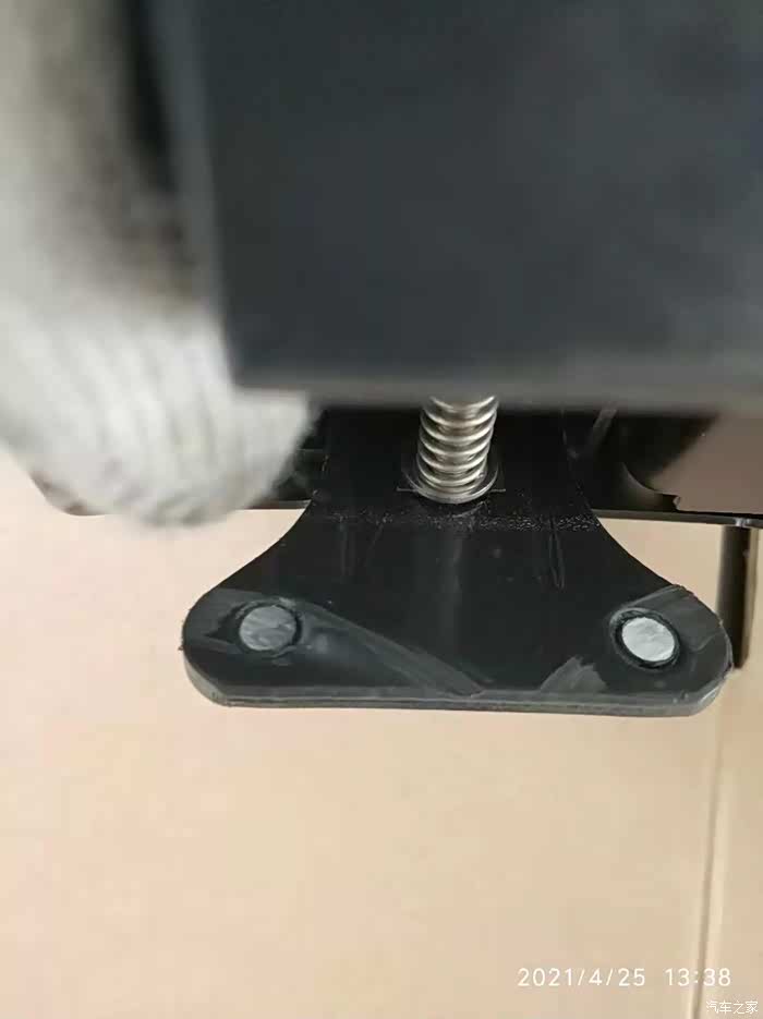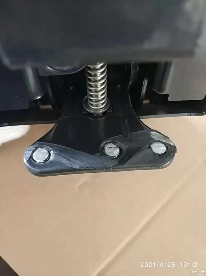 有一个承重座是有三个凸起柱,这个承重座有一块磁铁,应该是奥迪Q5上对应位置有个铁块方便吸合定位的。途安用不上建议拆除。注意图片上的黑色方橡胶块已经半拆下来了,因为我要打磨掉承重座上三个凸起柱所以拆下了承重座上下各一块的黑色方橡胶块。
