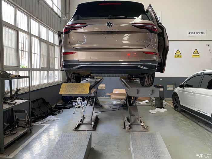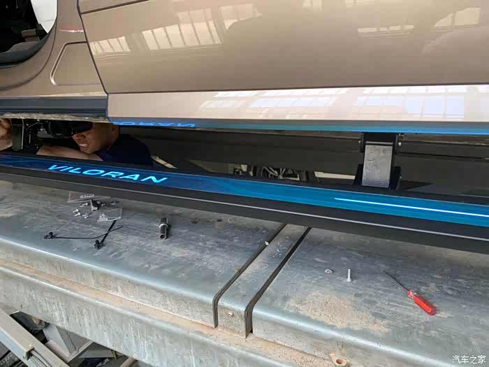 已经用车一年了,当时提车时激动的心情记忆犹新,交钱、提车、安装踏板一气呵成。一听说车已到店我们就赶过去了,到店交钱后,接待人员把车开到了售后车间,因为实在按耐不住心里的小激动,我也随之进入,安装踏板的时候我基本是全程观看的。今天来分享一下我的大V的电动踏板安装过程。