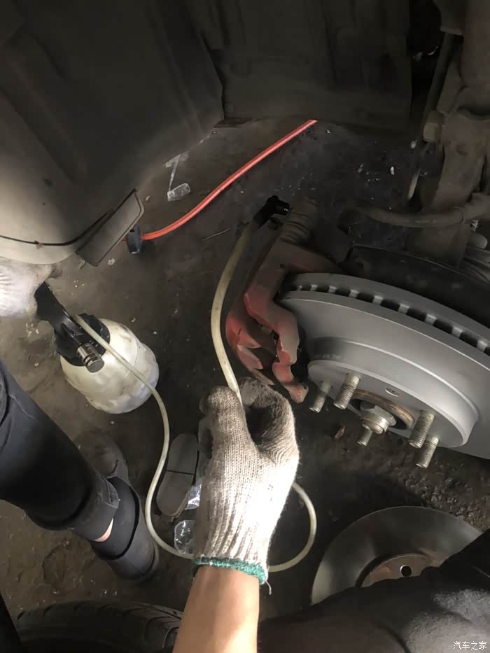 师傅开始用气泵抽旧刹车油,更换完毕后,必须要把油管里的旧油抽掉,这样才能更好的发挥新油的作用