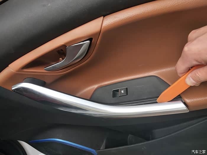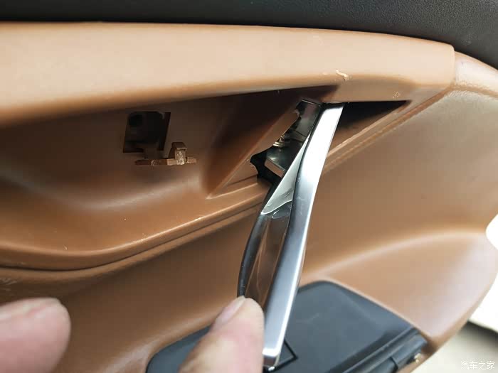 门把手的镀铬装饰用翘板给翘开,,就是几个爪卡住额,顺着一个方向翘,注意别把爪翘断了