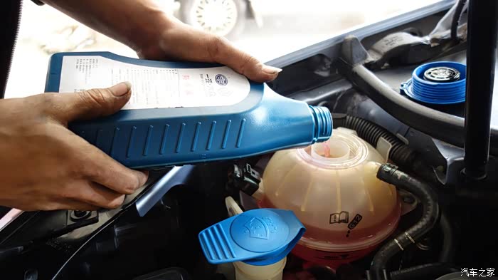 着车升温,让节温开关工作,冷却液开始循环,再继续加新液体。