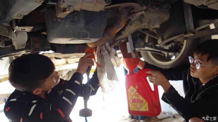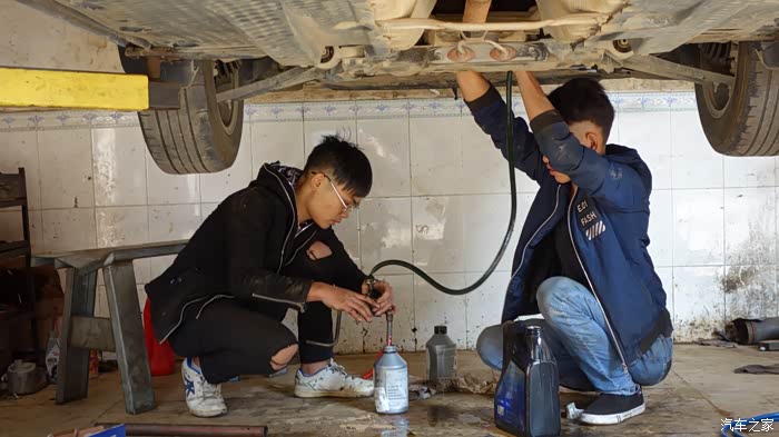 用简单的压油工具,把变速箱油加进去,好在有修车的朋友帮忙,两个学生在学习,非常简单的工艺。