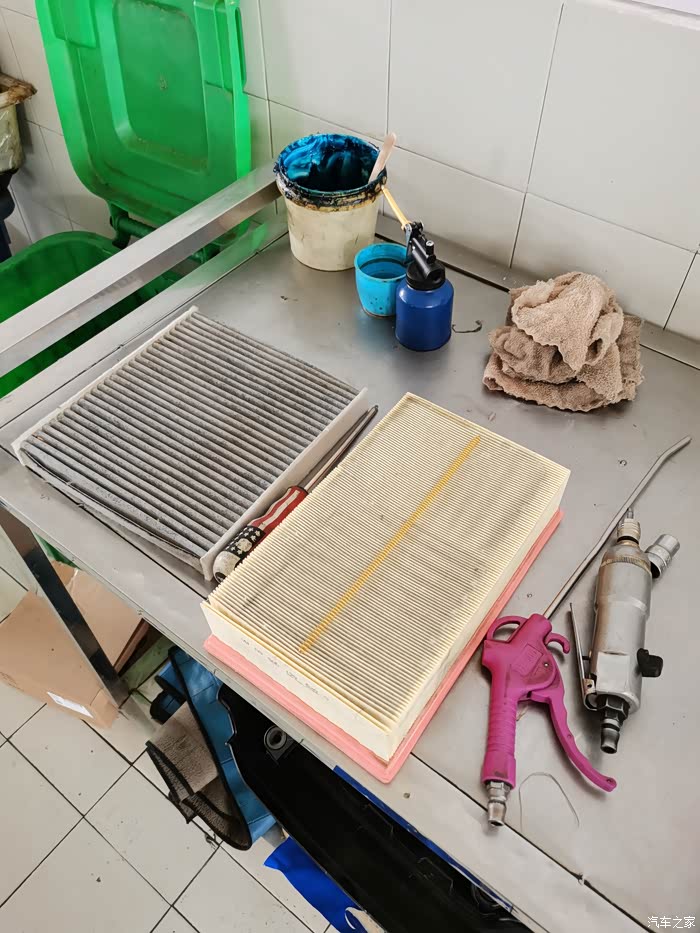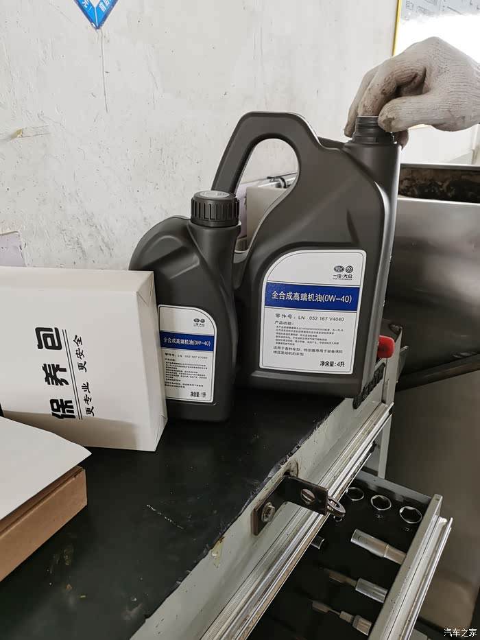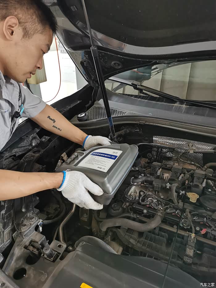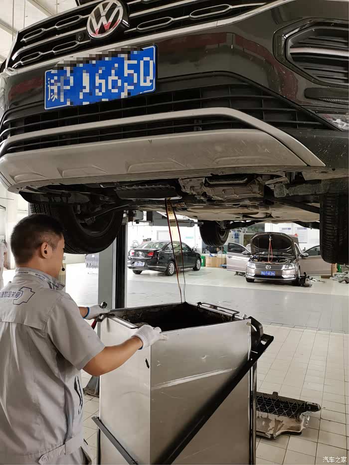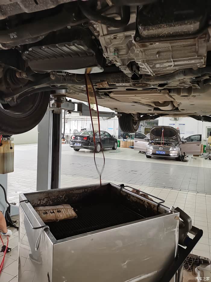 工作人员先给爱车更换机油,把旧机油先放出来。机油还是挺黑的。