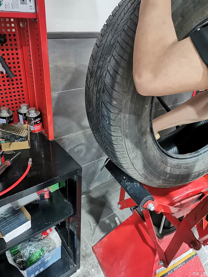 另外一个机器上,小哥正在忙活,正在进行另外一辆车的补胎作业 。