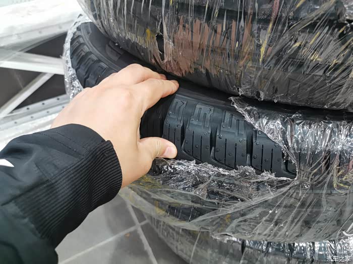 感受下轮胎,轮胎橡胶材料给人的感觉很厚实。