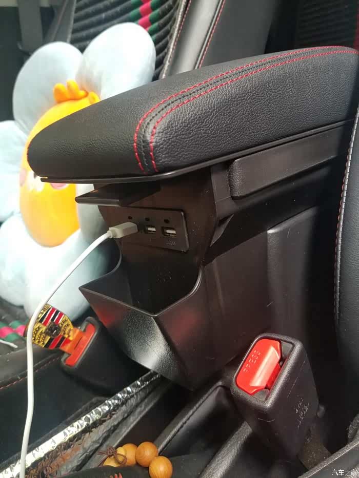 加装了这个扶手箱,塑料质感一般,但是挺实用的,增加了后排充电的USB接口,等红绿灯的时候胳膊有地方放了……
