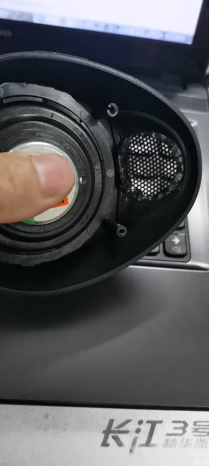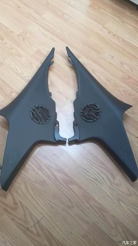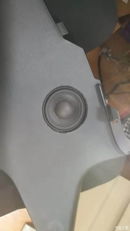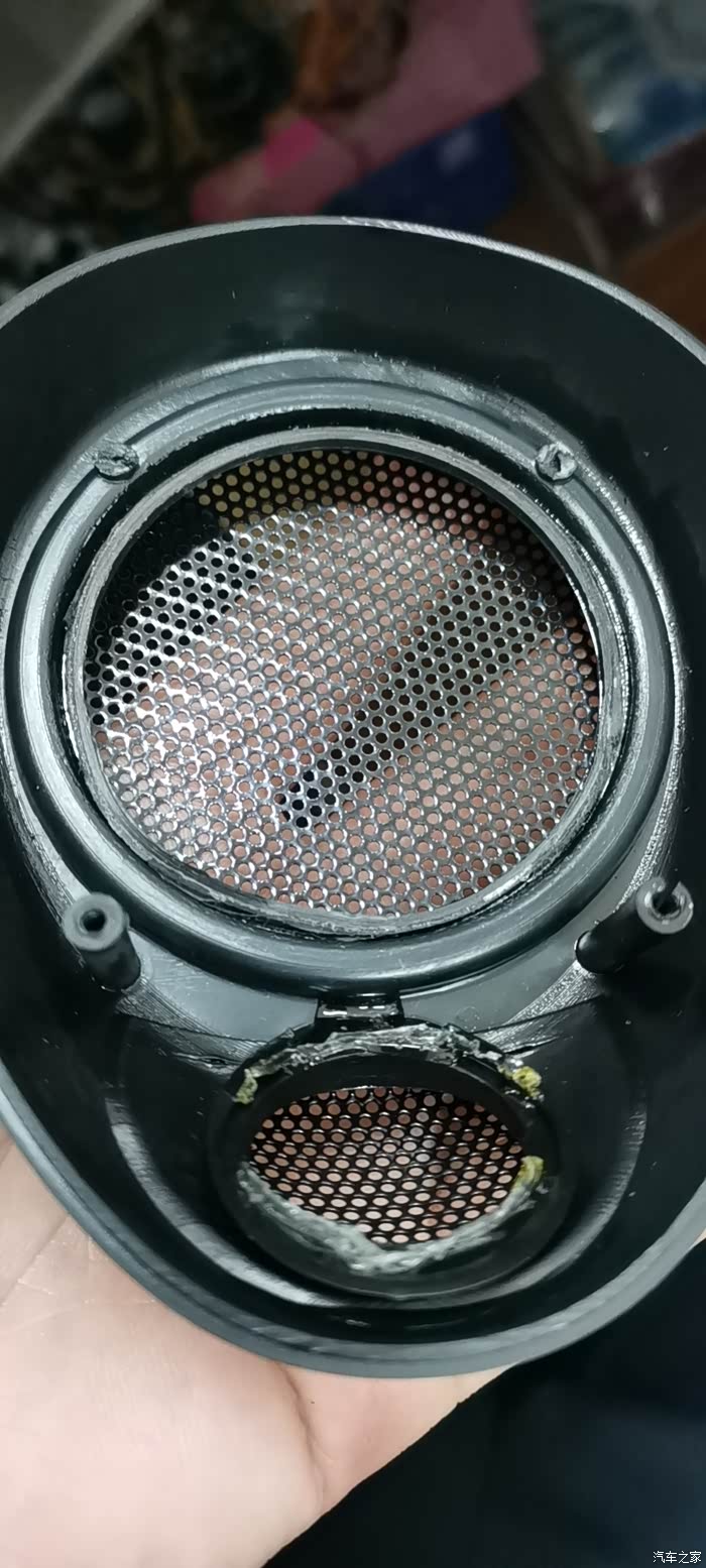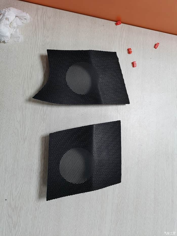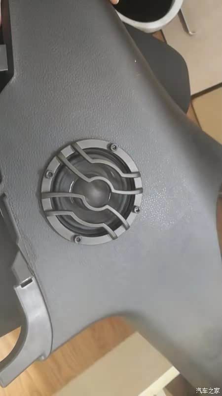 然后由于我高音倒模在A柱,我的中音就安在了仪表台左右喇叭罩下面,因为我把低音给移到了前门,中音因为是4寸的,喇叭网罩开孔太小,我自己做了下