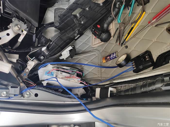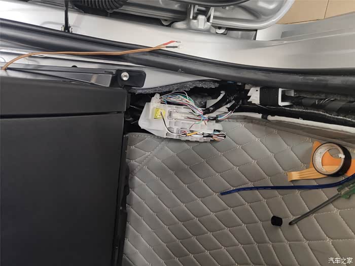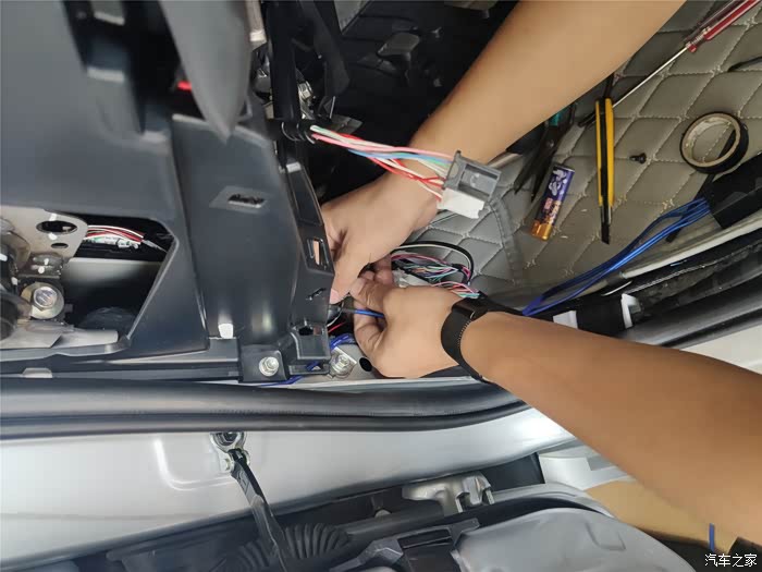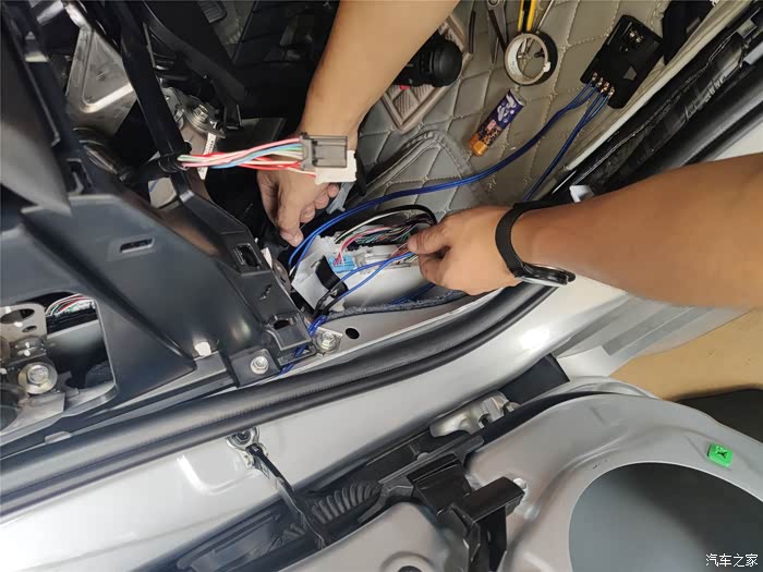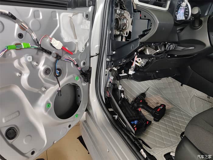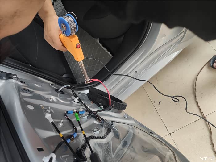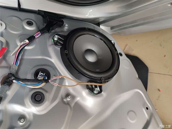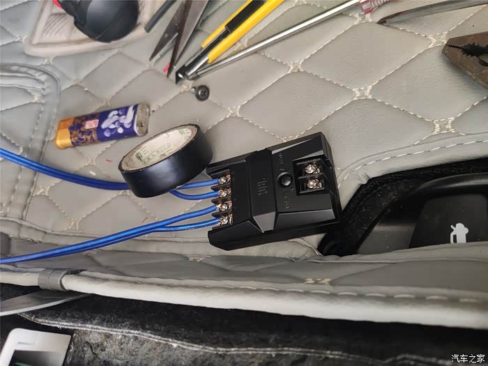 找出原车前门的音频线,破开,接长一段到分频器进线端。另外原车前门的音频也不够长,也要接一段线,然后接到分频器的W端。分频器的T端接高音头。高音头的线很短,也要接一段线。安装的时间基本都花在这里了。
