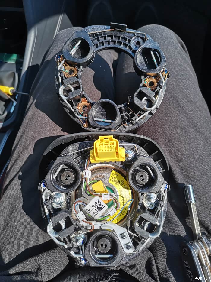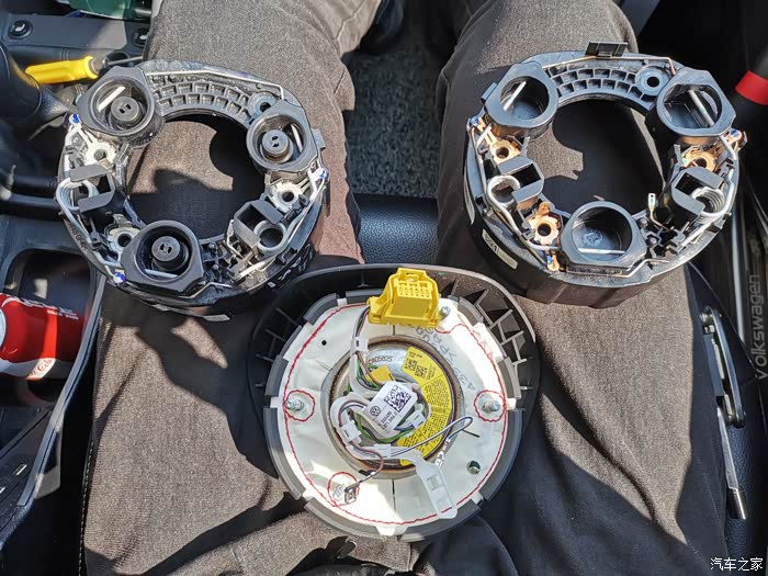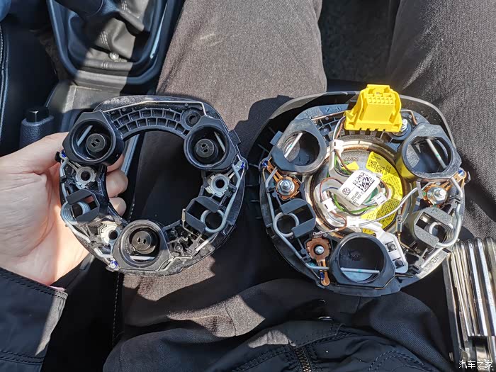 左侧捷达VS7方向盘气囊底座,右侧拆下来气囊和底座