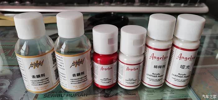 美国进口安格鲁斯皮革颜料到手,包括:去膜剂,白色,红色,稀释剂,哑光漆