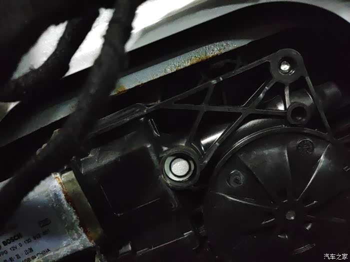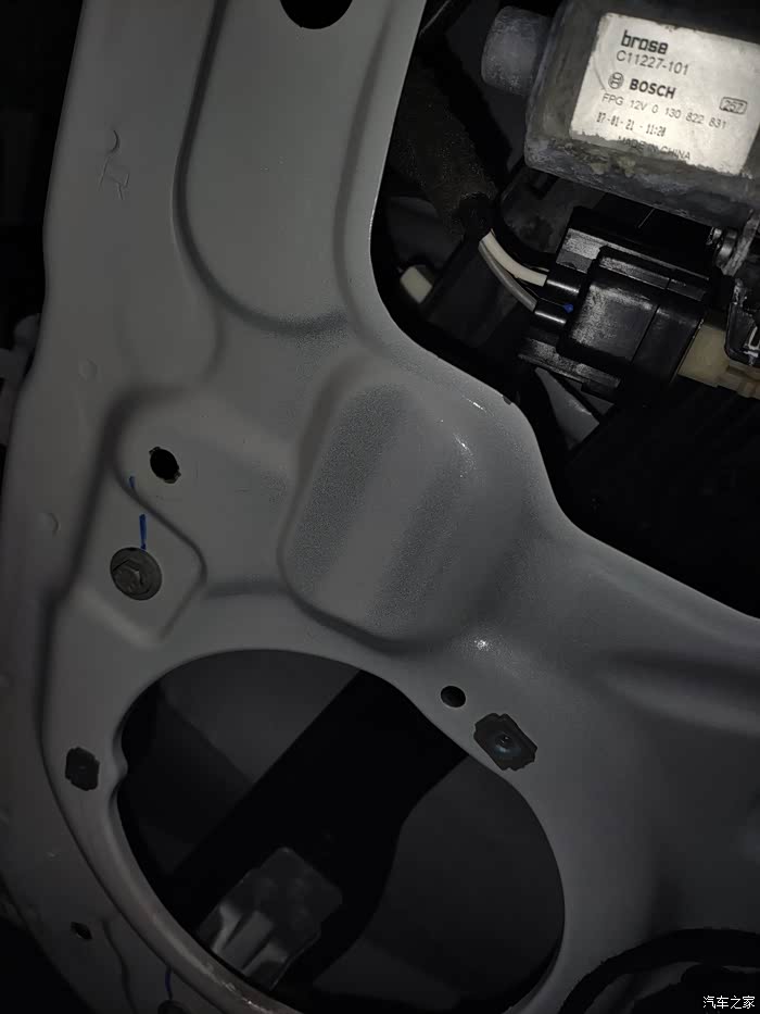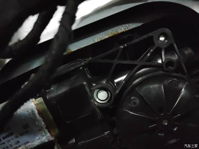 下面就可以开始正式的更换作业了,发现两个前门可以把上面玻璃升窗器的盖板打开,这样可以清晰的看见限位器;不打开不知道一打开吓一跳,里面居然已经锈迹斑斑了,才4年的车,锈成这样,10年不得锈穿。