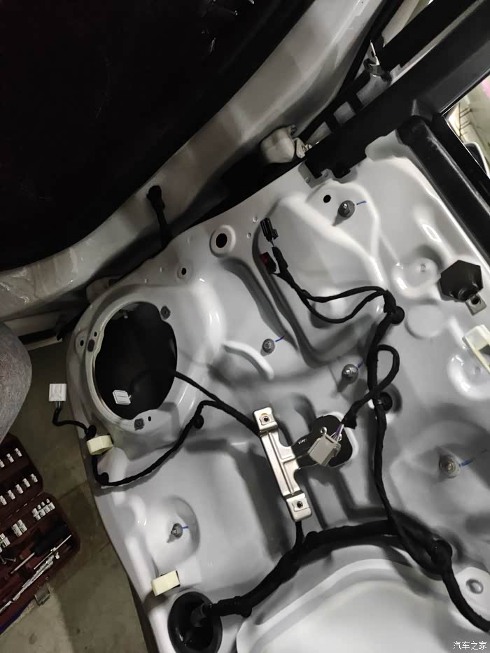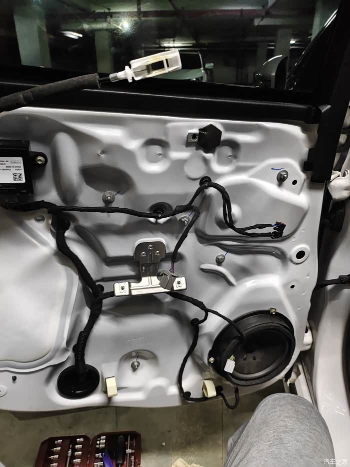拆卸门板的教程就不发了,四个门都一样,大概是拉手后面一个盖板用撬棒翘出,后面一个10mm的螺丝拧掉,升窗器按键板用手抓住用力向上提,露出两个5.5mm的螺丝,拆下,并把升窗按键线束拔掉;门板下方有两个斜着的7mm的螺丝,也把它拧下来,然后就是大力出奇迹了,拉住门板水杯架位置用力一拉门板下方就脱落了,上方还挂在上面,接下来就把门饰板端住往上提一下,这就彻底分开了,把后面的高音线束,锁门按键线束,还有拉手拉线卸下,这样门板就可以放一边了。