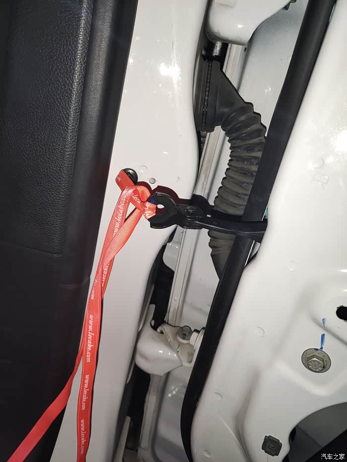 新的按照怎么拆怎么装的方法安装,发现装不进去,多了一个罩子,太长怎么装都装不进去;想办法把他缩短,用手把限位器缩进罩子里就短了,缩到关门状态,轻松装进去,用两个螺丝把限位器固定在车门上;新问题又来了,限位器缩进去那就是关门状态不能拧车身那颗螺丝,需要把限位器拉出,缩进去都是废了很大劲按进去的,拉出来没有那么容易,只能想办法,用手拉不出来,用扎带一拉就断,只能用绳子,靠绳子的拉力把限位器拉出来;车身螺丝先拧上,留一条缝的距离,绳子穿过限位器螺丝孔把车身螺丝套住,关门把绳子收紧,再开门,限位器就出来了(具体怎么穿绳子可以看下面的图片)。