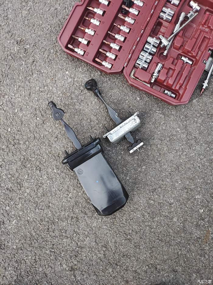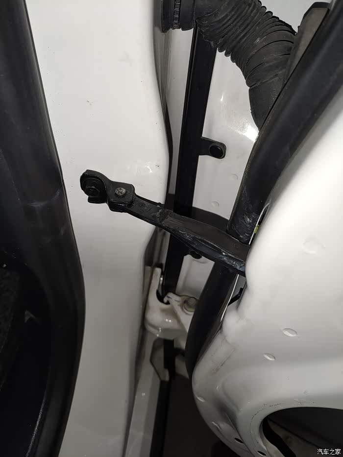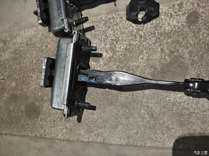 这个锈了先不管它,开始我们的正事,拆限位器,车门上两个螺丝,车身上一个(这个螺丝很紧需要使劲),都是用10mm的套筒可以卸下。螺丝卸完就可以把限位器从喇叭孔里拿出来,新款是带有防水罩的,原车的是没有的,这个就是造成异响的原因,进水导致内部没有润滑了。