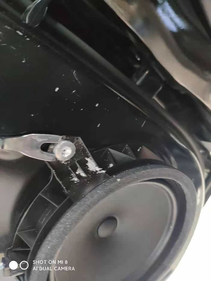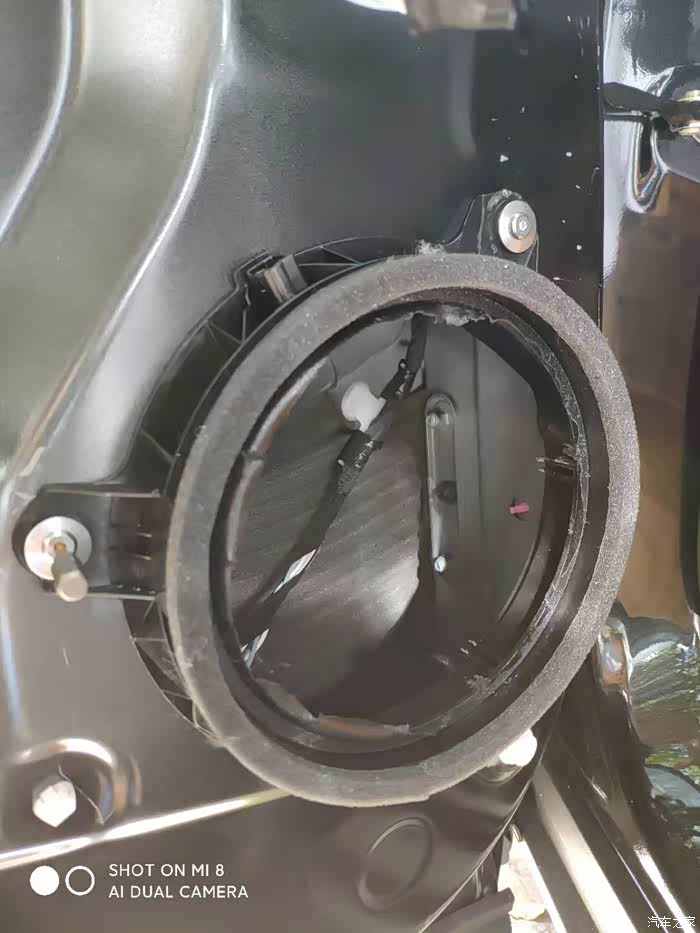 上了垫圈后就安装喇叭,把喇叭线插上喇叭,用自攻不锈钢螺丝拧上,我是上了6个螺丝感觉非常牢固,安装好的忘了拍照,装好后我是只铺了一层温莎棉,400克的,裁好贴好就行,因为安装是我一个人操作没拍照片,记住,安装门一定要把留在铁门上的卡扣取下来,全部安装回去门套上,先把玻璃摇下来,先卡门上面感觉有点像挂上去然后沿着周边一路卡回去,最后安装完成