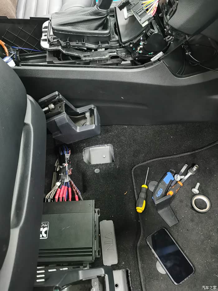 功放装在了副驾下面 主驾下面没有地方 也不想装后备箱的储物盒 七座的锐界本来后备箱下面的储物盒也不大 而且走线也麻烦