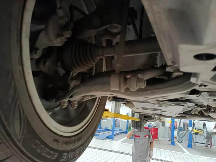 加完机油车升起来,苏师傅把四个轮胎气压全部检查一遍, 因为前段时间刚换轮胎检查的气压,所以这回检查气压也不低
