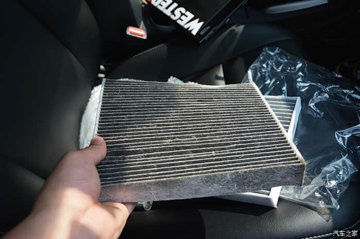 分离上盖之后便可以取出滤芯,整体的操作没什么难度,空调滤芯新旧对比,应该有3万公里没有更换过了,看上去新旧对比差异还是十分的明显的。