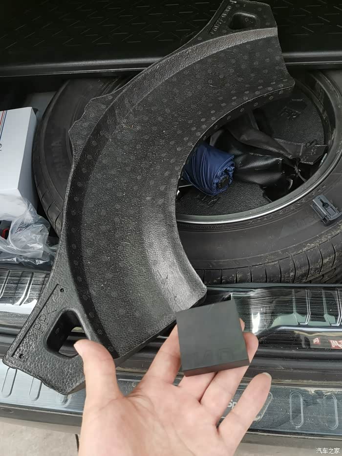 先把原车半尺寸备胎下边的防震泡沫取出来,后边一大块,前边一小方块。