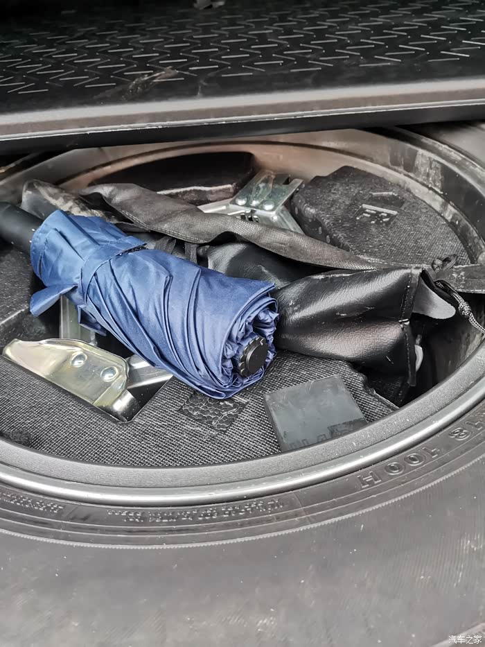 原车泡沫支架手动千斤放轮毂里到底正好合适,不晃动,离轮胎面有七八公分空间。可以放好多东西