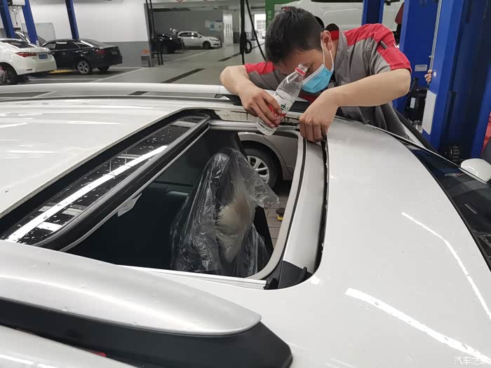 检查天窗排水口,好像有一点堵