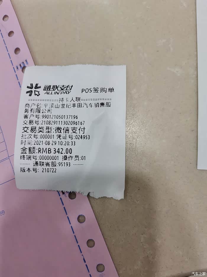 机油是买车时送的,就是个圈套,以后保养车都到4S店,机油钱不算,机油滤芯及空气滤芯等等,主要是工时费。保养预约有优惠折扣,共计342元,算是一个小保养。