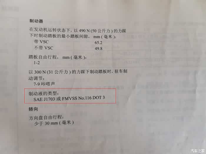 手册上有说明使用什么规格的制动液(刹车油),DOT3的就可以了,很多维修厂会直接推荐DOT4,但这个维修师傅说这个可以使用DOT4,这个我觉得使用原厂DOT3,就可以了