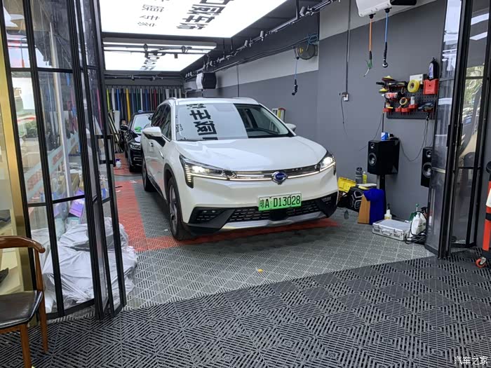 因为连续贴了几台车,场内还没来得及收拾,都是贴玻璃膜和车衣的,后面那台宝马就是贴车衣的,车主们都是各种催,整的师傅们一直在赶工,然后我来了,也是催,因为我着急回家,哈哈哈哈哈,特别安排2个师傅帮我贴