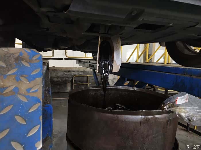上举高机,准备放机油!我一直选择机油都选择美孚速霸的全合成机油,虽然价格是有些贵,但是最起码机油质量靠谱,不容易发生乳化失效,也可以适当从5000公里延长到7000公里保养!