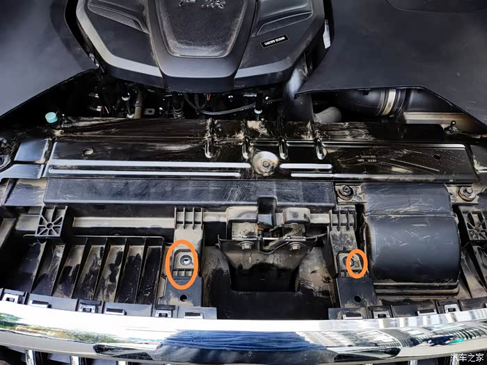 总共有四个螺丝,两个卡子,小区停车位狭窄,只能拍到两个螺丝位,用橙色圈出来了。