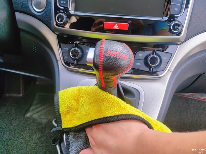 还有这个挡把的位置,也是平时开车用的最多的地方,上面也有很多的汗,先在毛巾上面喷一些水雾,然后再擦干净就行了。