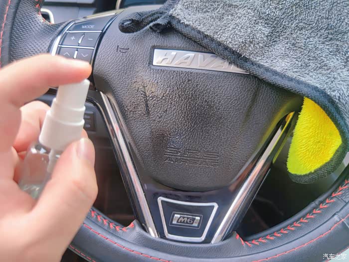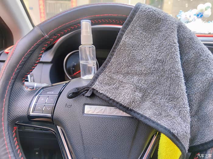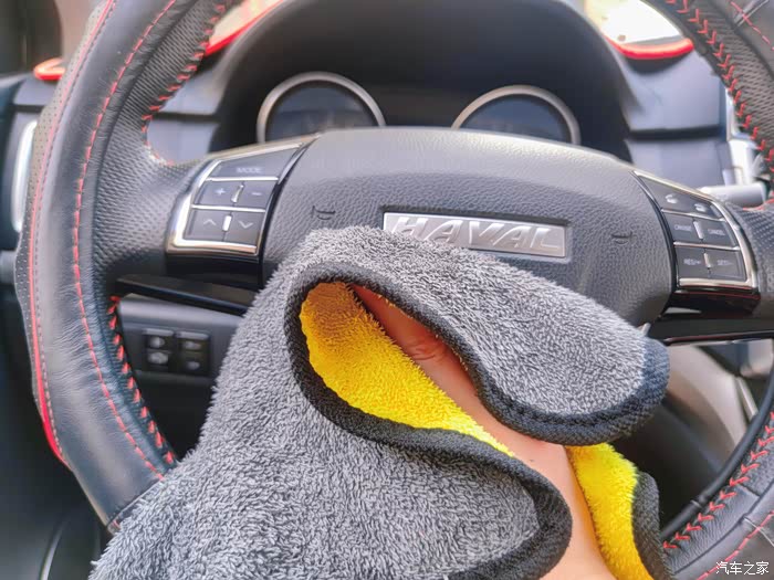 这个方向盘上面哈弗的大logo也是比较显眼的,这个logo的话在所有的车型上都是同样的造型,这估计也是家族式元素设计。还有方向盘上面这些多功能键也要用毛巾擦干净,但是这里的话就不能喷水雾了,要不然那个水雾跑到里面去短路了就麻烦,就用干毛巾擦干净就行了。