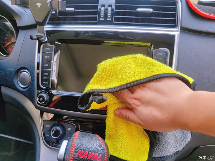 这个车机屏幕虽然说它的功能不是很多,但是上面还是有很多指纹印,也要把它擦干净拿毛巾。这里的话一定要用毛巾的干面去擦不能有水哦。