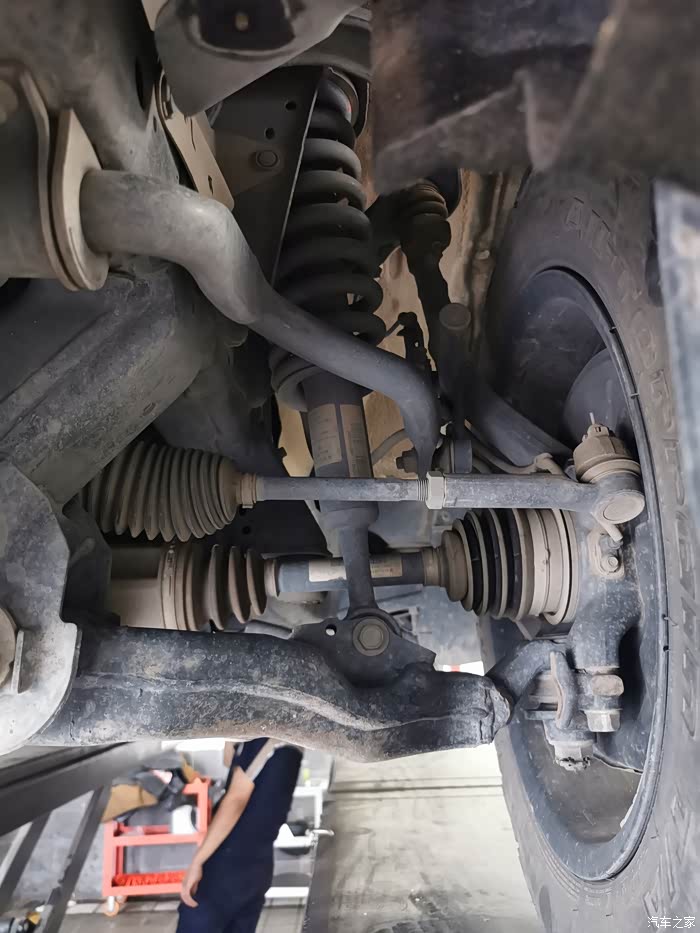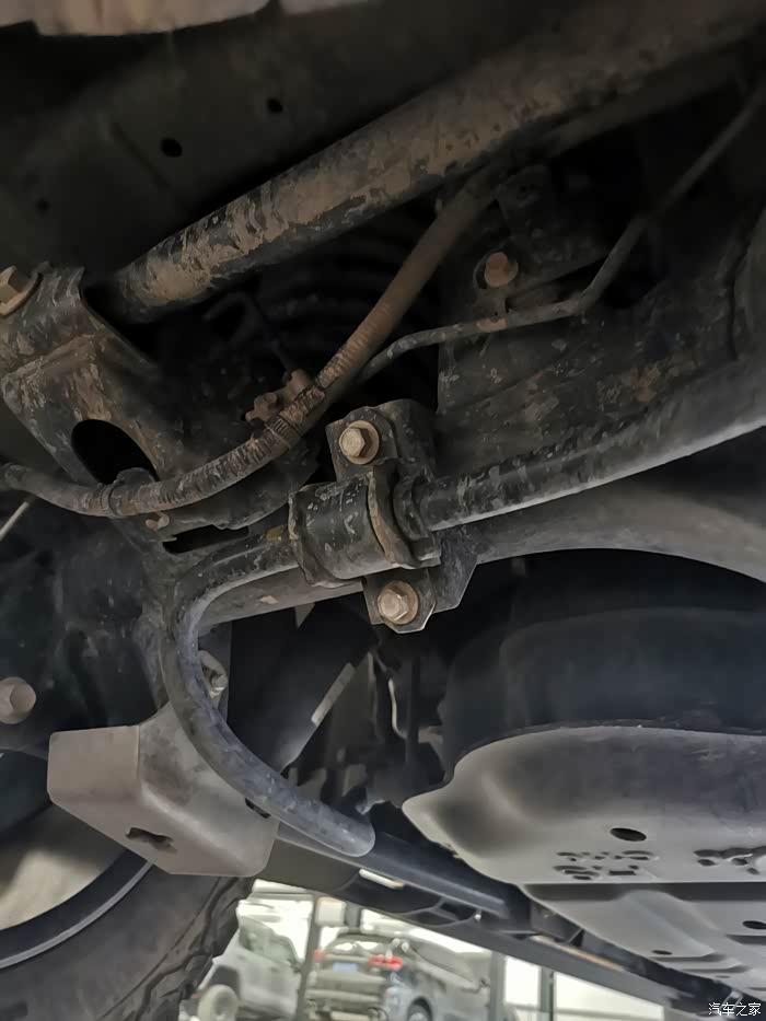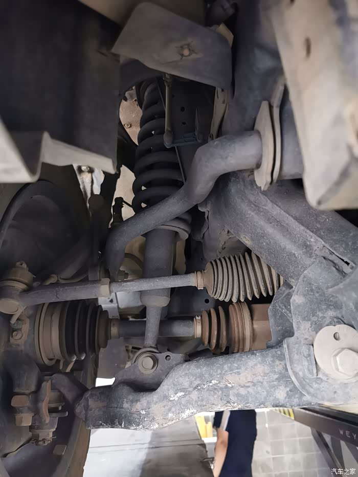 检查完后,开始起架子,检查底盘,可以看出前杠在经历过多次出游之后已经破烂不堪,到了无法修补的地步。