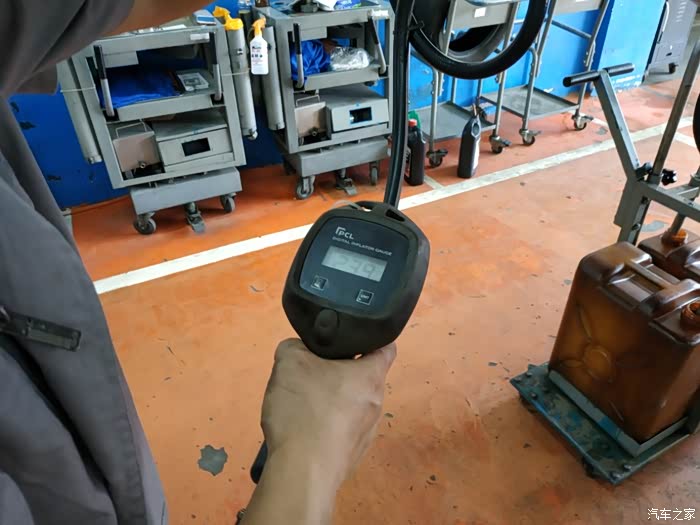 把车子放下来,换上机油,机油也是纯牌的产品,然后查看一下尺子,再把防冻液和刹车都查看了一下,电瓶测试一下,看一下电压是否正常。