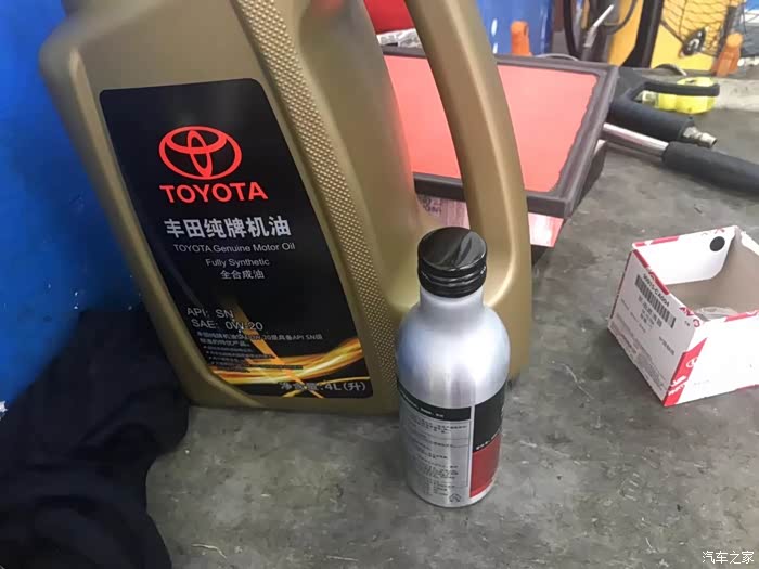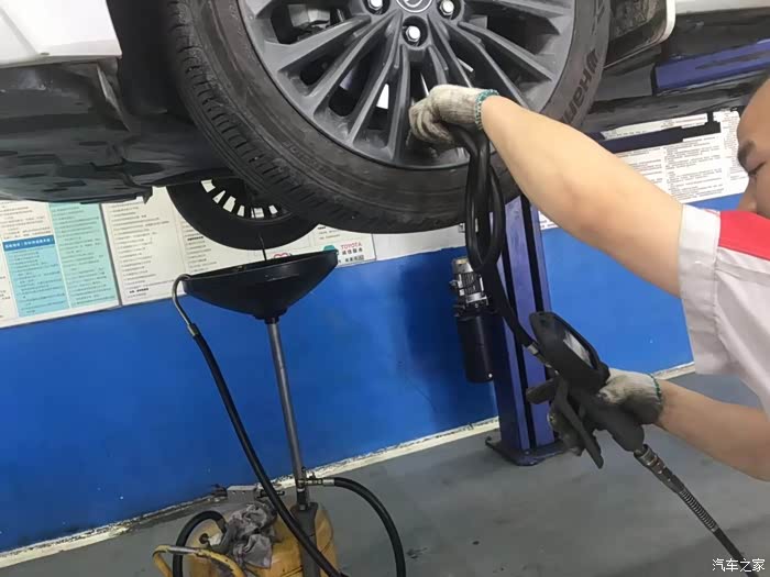 再把车子缓慢的降下来之后,换上新的机油,将机油倒入的时候不好操作,维修师傅办法还挺多,然后查看机油标尺,再把车子防冻液和刹车油都查看了一下,还给加了喷油嘴的清洗剂,直接倒入就好,还真是方便。还用专门的仪器检查了电瓶电压。