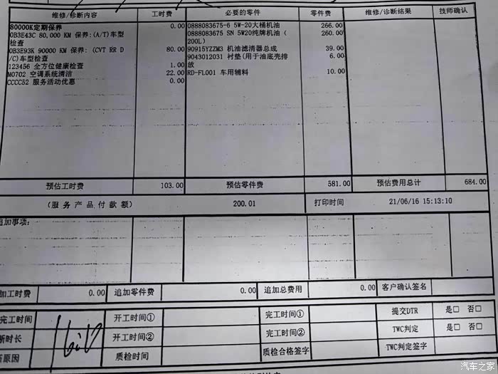 账单,一次常规保养六百多