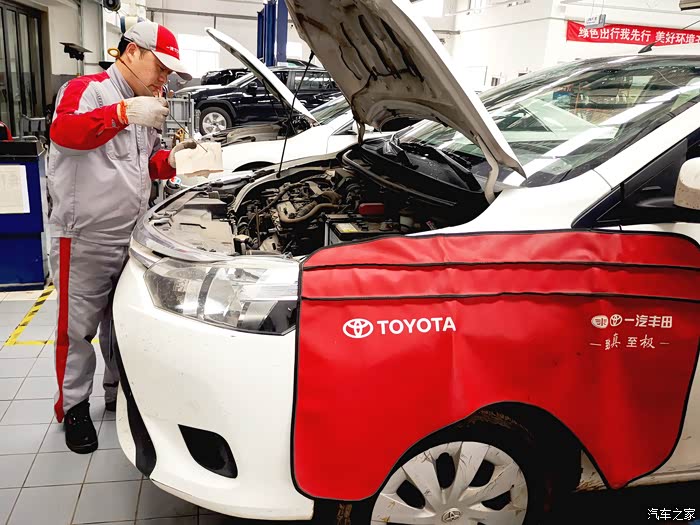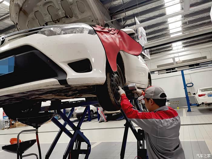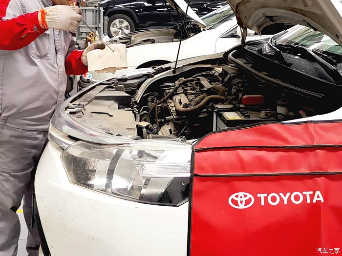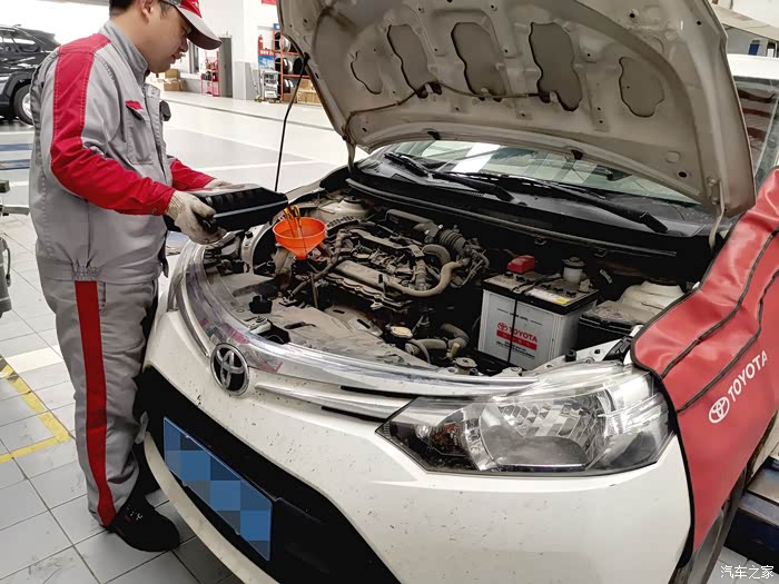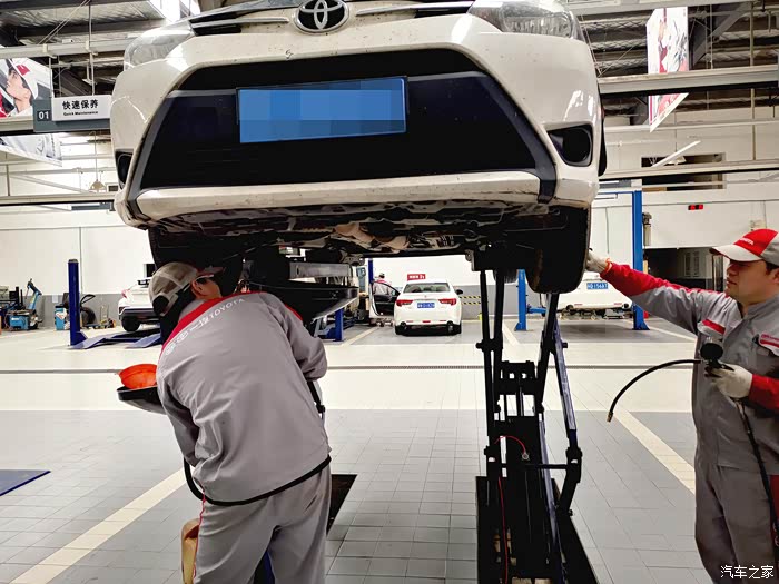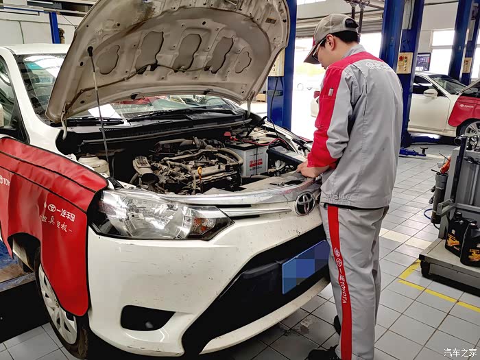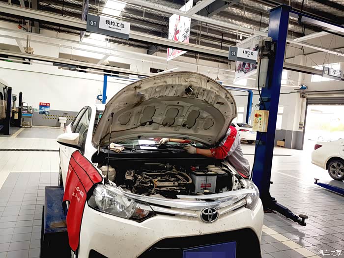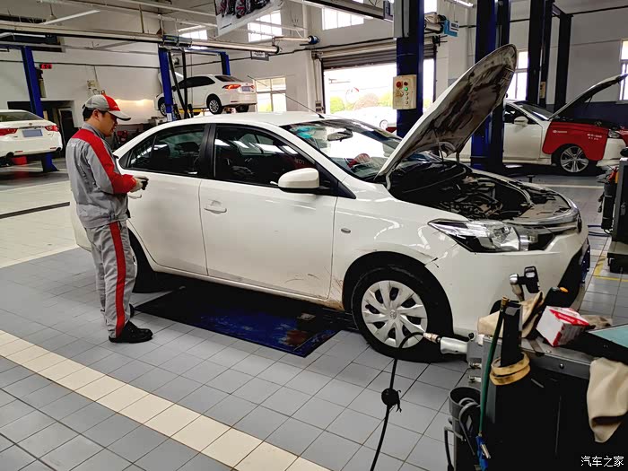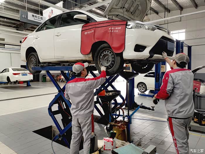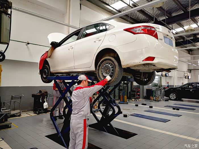 像每次一样这次保养也是先跟客服进行电话预约,之后到了店里就立刻安排车子保养了。打开前机舱检查清理,前机舱是整个车子的心脏部分。师傅每个线路都特别细致地进行检查。小威驰还挺皮实的,在半路上也不会有什么故障出现。再接着把车子升起来检查底盘,紧固螺丝,放掉废机油,放油是每次保养必须经历的一个环节,也是我最为看重的一个环节。