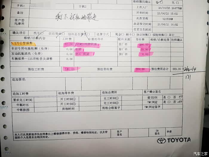 把发动机舱的灰尘清理好,检查各个零部件之后,就把车子升起来放机油了。售后的小师傅耐心检测各个轮胎的胎压。甚至连备胎也都补足,还贴心的把备胎的胎压补得高一点,因为备胎不常用的,所以需要稍微比正常的2.4高出一点。放掉废旧的机油再接着就是注入新鲜的血液了。全程都是原厂的机油零件,还带二维码查真伪。过程都非常的快速和专业。让我感受到了贵是有贵的好处滴~虽然是贵,但也贵不了多少,相对来说还更值得信赖!