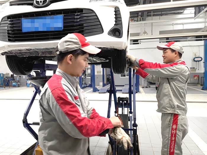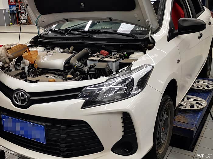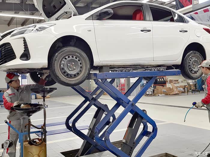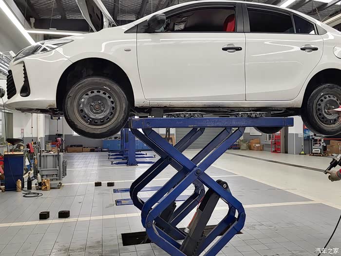 工作人员让我在休息室休息,反正自己也没事就想着溜达一圈看看保养到底是做了哪些项目。到车间以后小威已经在保养工位上了。方向盘和主驾的位置都套上了防护。师傅先把发动机舱打开清理,看看机油玻璃水的位置,拆掉空气滤芯,空调滤芯,因为买车时间还不算长,双滤芯都还不怎么脏,清理之后就装回去继续用了,然后把小威升起来,师傅们检查底部的螺丝,换机滤。