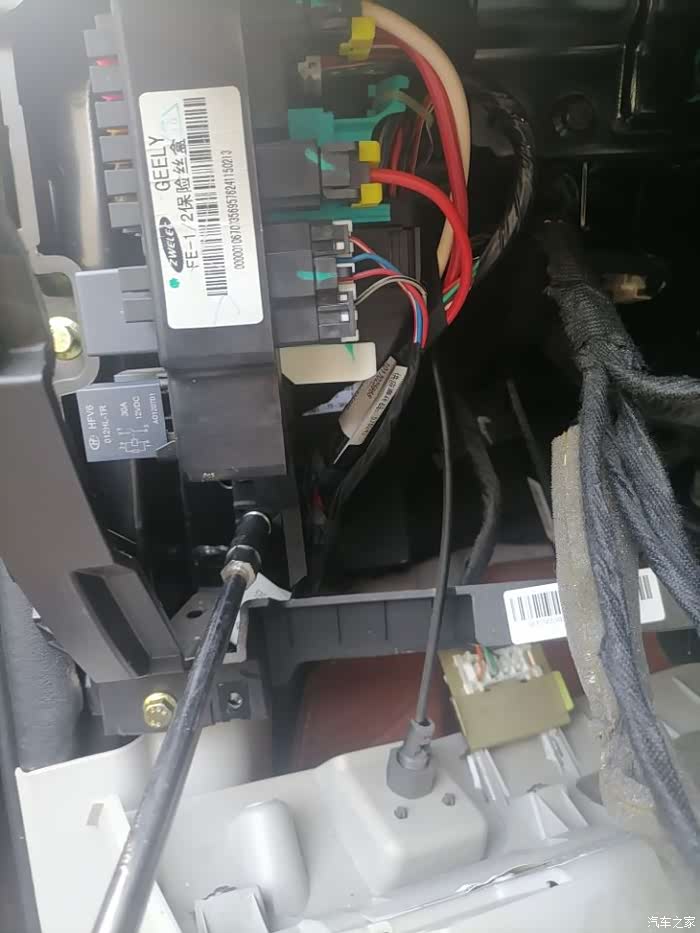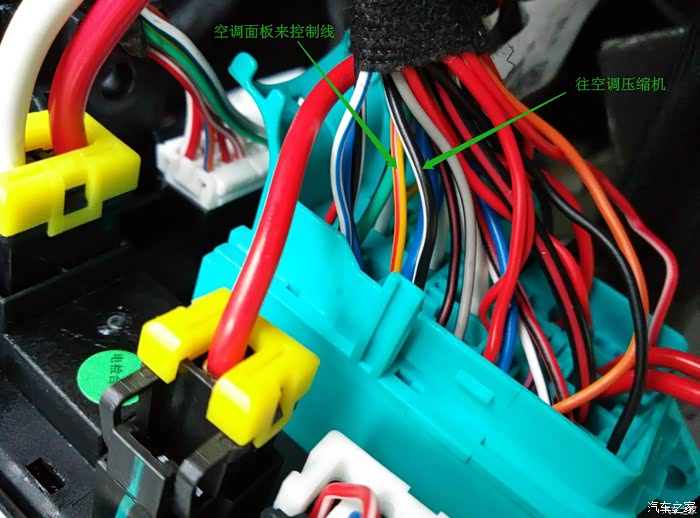 这是空调压缩机控制线及供电线的放大图,图中黑白线为压缩机离合吸合所需的供电线,黄红线为空调控制面板过来的信号线。不同年款颜色可能有所不同,但是基本都是在这个位置,因为他们的保险电路板是一样的。这里可以无损取电,也可以剪断接线,我为了方便操作把这两线都剪断了