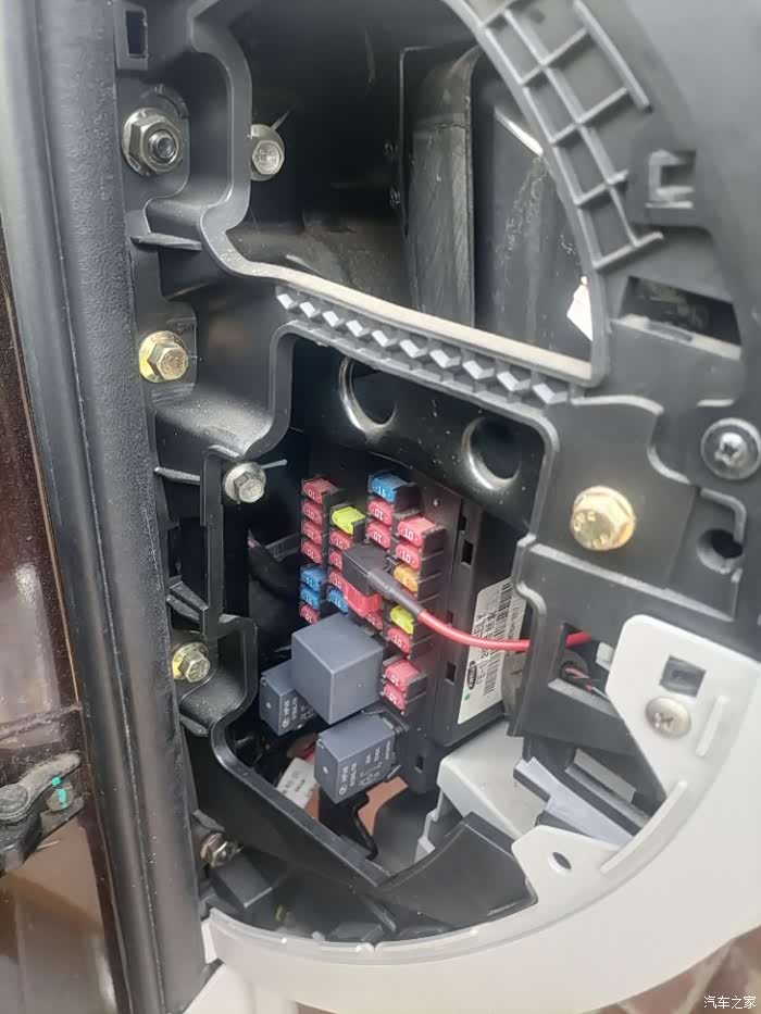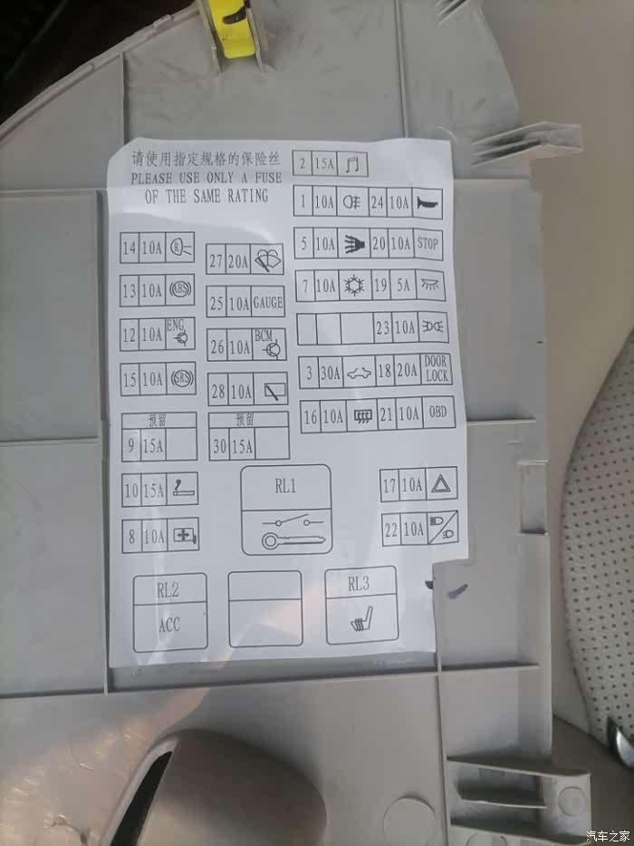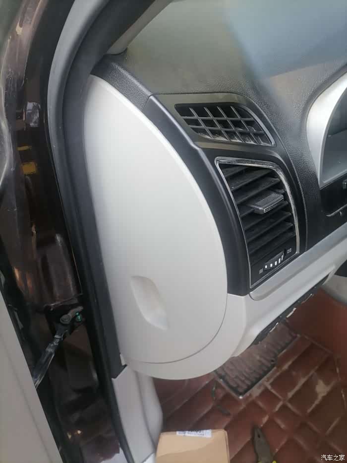 配件到了,下面开干。第一步拆驾驶位一侧的装饰板,厂家有设计一个扣手的地方,一扳再一撬装饰板就下来了!拆完装饰板后就看到室内保险盒了