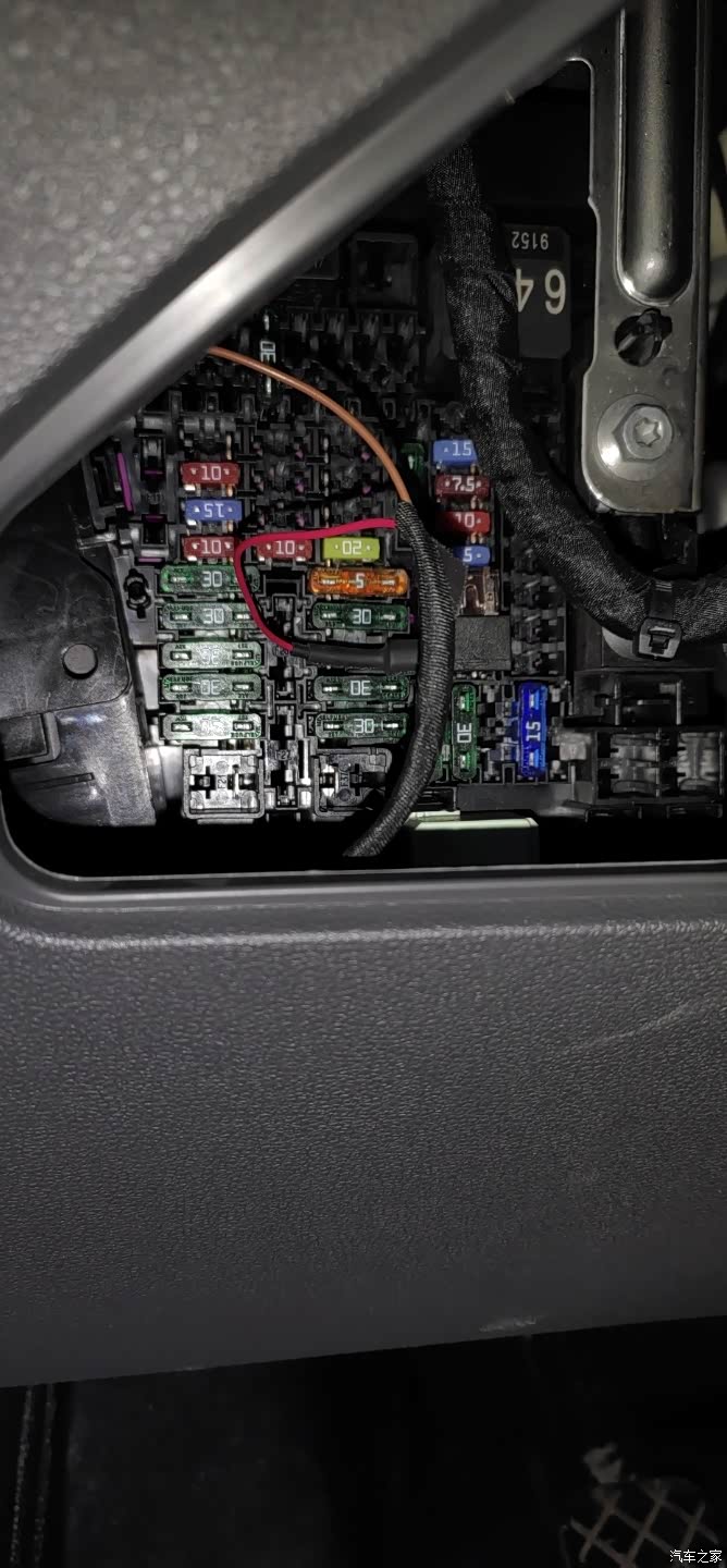 车机有了摄像头的影像信号,还需要摄像头供电,供电位置在方向盘左下的保险盒里面,按照摄像头的说明书,取电即可!拔掉10安保险,替换一下就好了,负极搭铁,随便找到一个和车架相连的螺丝,固定到上面就行了!一定要与车架相连,别接在塑料件上!