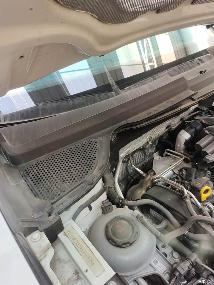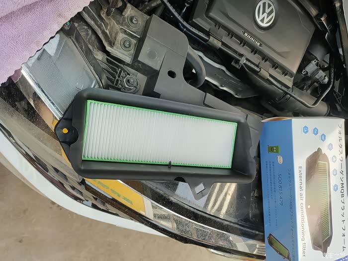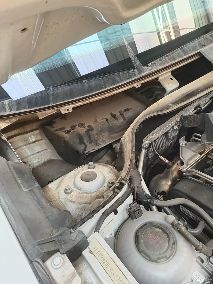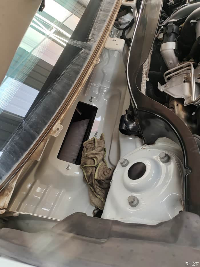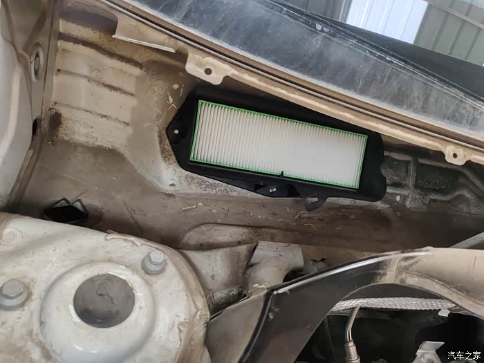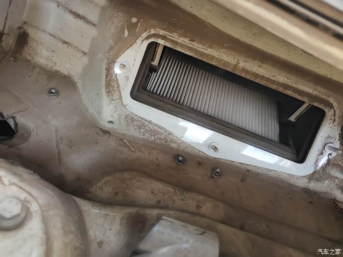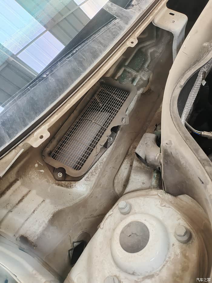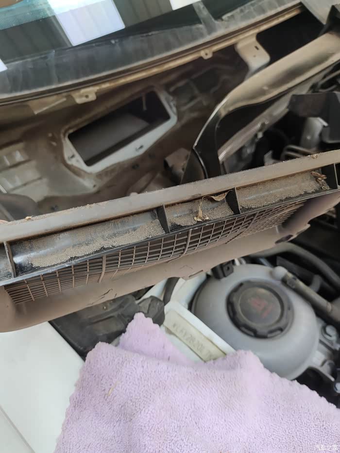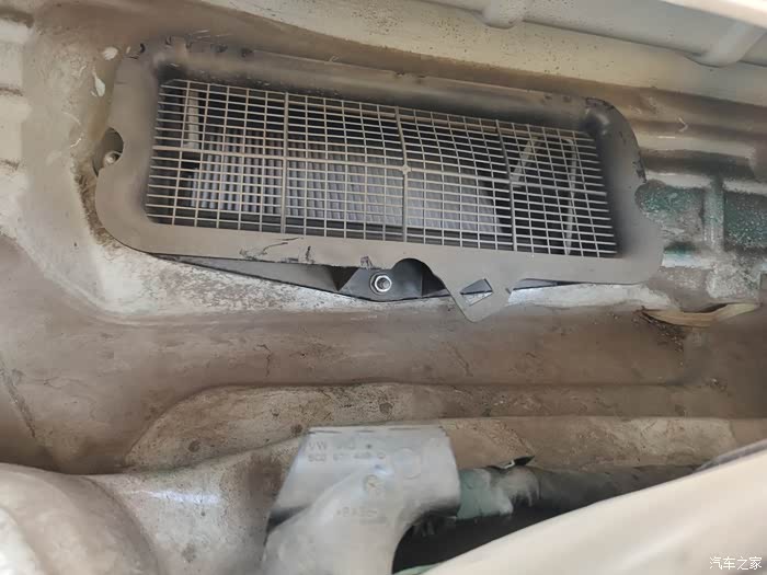 这下看到咱们的空调滤芯了吗?这是前几天刚换的。看到进气口的格栅了吗?只能挡住树叶和杂物,挡不住一点灰尘,灰灰全到滤芯里了。这就是车主反应开暖风和空调有土腥问的原因了。