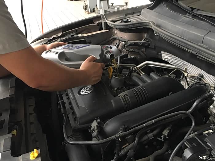 该帅气的老王上场了,全新的原厂5W-40的半合成机油加进去,这又能跑5千公里了!由于和老王聊天太投入,放油和更换机滤都忘记拍照了!由于老王也是捷达VS5的车主,保养起小五来动作娴熟,没几分钟就全都搞定了!忘了给老王来张露脸的照片了!