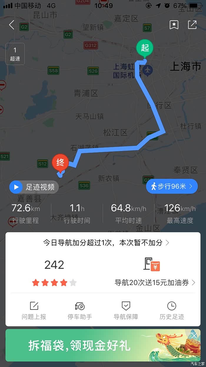 72公里的路回家用了1个多小时,3/4的高速,保养一次来回将近150公里了!