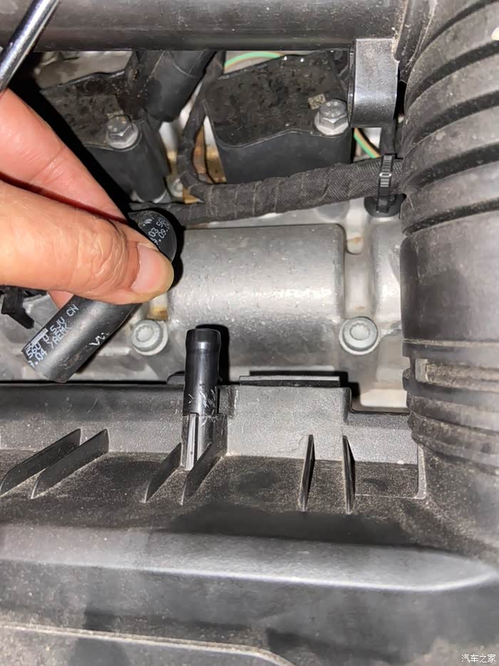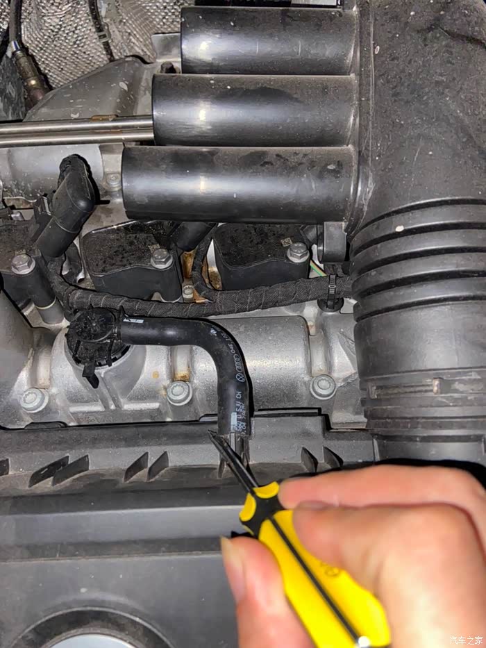 首先拉开发动机舱,打开把引擎盖支撑好,第一步先撬开引离引擎盖最近的那根管子,然后第二部撬开发动机进气这跟小管子,然后取卡钳。然后轻轻的左右摇换往上提。