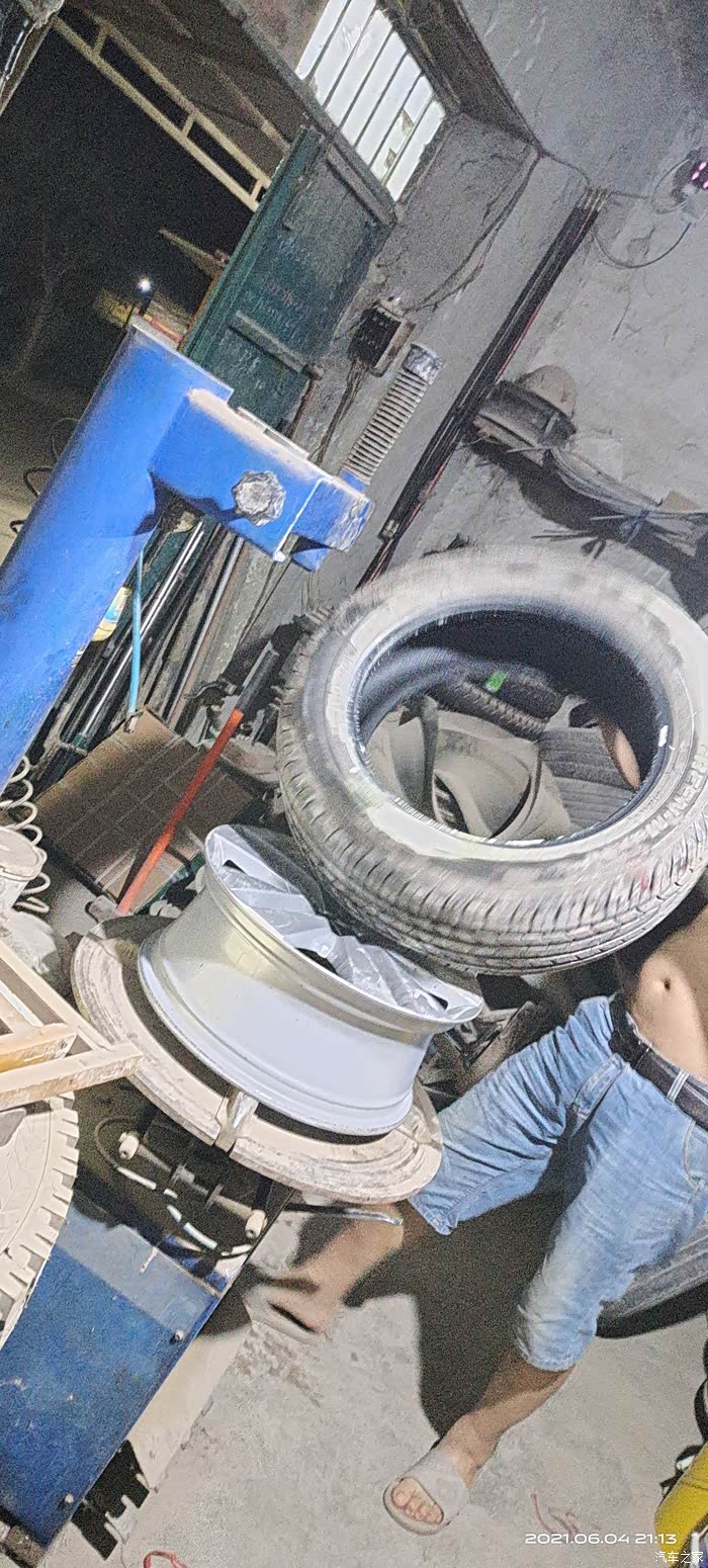 这是在剥轮胎,把轮胎从轮毂上取下来,以前我见师傅们都是弄个大铁棍去的,现在高级了,放在这机器上,一转圈就剥离了,挺方便。